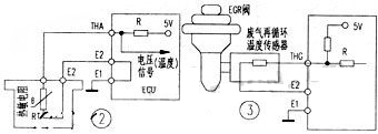 安裝好冷卻液溫度傳感器,將傳感器的連接器插好。當點火開關置于 ON 位置時,測量圖 1 中連接器“ THW ”端子 ( 豐田車 ) 或 ECU 連接器“ THW ”端子與 E2 間輸出電壓。所測得的電壓應與冷卻液溫度成反比變化。