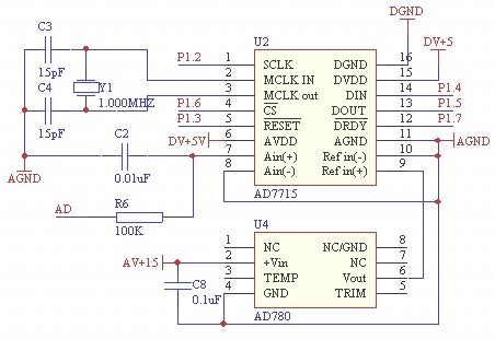 為了實現對微壓力的實時測量,使用 16 位的AD7715 對輸出電壓進行采樣測量,其中AD780 提供2.5V 高精度基準電壓。P3.1 腳提供了AD 工作所需的時鐘,P1.4 和P1.5 腳接收和發送通訊數據,P1.6 是片選信號,P1.7 接DRDY ,AT89S52 可以通過查詢P1.7 的狀態來判斷是否可以讀取AD 轉換結果。A/D 接口電路如圖3所示。