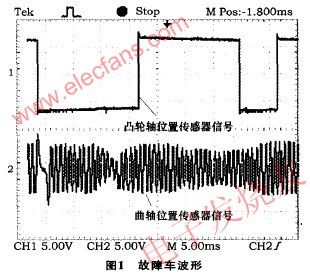 故障分析與測(cè)試采用雙蹤示波器同時(shí)測(cè)量故障車上曲軸位置傳感器與凸輪軸位置傳感器的波形如圖1所示,在同類型的正常車上測(cè)得的凸輪軸位置傳感器和曲軸位置傳感器波形如圖2所示。