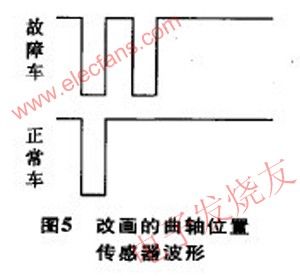 有無(wú)波形可得出圖5中的2個(gè)波形,ECU只有得到圖5下圖波形才能發(fā)出點(diǎn)火信號(hào)起動(dòng)發(fā)動(dòng)機(jī),而ECU得到圖5上的波形不能發(fā)出點(diǎn)火信號(hào)起動(dòng)發(fā)動(dòng)機(jī),但在偶然的時(shí)刻故障位置產(chǎn)生的波形恰好達(dá)到合格的底線時(shí),就可以起動(dòng)發(fā)動(dòng)機(jī)。起動(dòng)后,ECU對(duì)曲軸位置傳感器波形的檢測(cè)就不是那么嚴(yán)了,因此,發(fā)動(dòng)機(jī)起動(dòng)后不會(huì)熄火。也就是此車故障的根本原因。