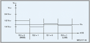 圖2顯示了一個4位轉換過程的例子,圖中Y軸和粗線表示DAC的輸出電壓。