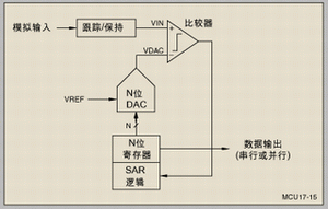 該結構將模擬輸入電壓(VIN)保存在一個跟蹤/保持器中,N位寄存器被設置為中間值(即100.。.0,其中最高位被設置為1),以執(zhí)行二進制查找算法。因此,數模轉換器(DAC)的輸出(VDAC)為VREF的二分之一,這里VREF為ADC的參考電壓。之后,再執(zhí)行一個比較操作,以決定VIN小于還是大于VDAC: