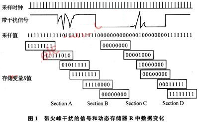 從單片機計數輸入端,觀察信號波形。為便于分析,在高、低電平段設置了幾個干擾尖峰脈沖,分別標示為Section A和Section C,占空比信號下降沿、上升沿分別標示為Section B和Section D。單片機按計數時鐘周期性采樣,采樣值中“1”表示采到的是高電平,“0”表示低電平。I/O口采樣占空比信號輸出端口中狀態,利用1個字節型變量R來動態存儲采樣值??刂破髅坎蓸?次,變量R中數據向左移1個二進制位,R原最高位電平狀態被移除,而當前時刻新的采樣狀態保存到R的最低位,變量R被更新了,狀態存儲器R中保存著最近8個采樣周期的采樣值。
