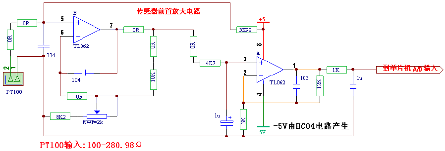 傳感器的接入非常簡(jiǎn)單,從系統(tǒng)的 5V 供電端僅僅通過一支 3K92 的電阻就連接到 PT100 了.這種接法通常會(huì)引起嚴(yán)重的非線性問題,但是.由于有了單片機(jī)的軟件校正作為后盾,因此就簡(jiǎn)化了傳感器的接入方式.