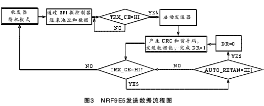 在現(xiàn)代無(wú)線通信中,數(shù)據(jù)都是以數(shù)據(jù)包的方式來(lái)進(jìn)行傳輸?shù)?對(duì)NRF9E5這樣的無(wú)線片上系統(tǒng),每次發(fā)送和接收數(shù)據(jù)也是以數(shù)據(jù)包的方式進(jìn)行的.數(shù)據(jù)包格式是通信協(xié)議的重要部分,NRF9E5的無(wú)線數(shù)據(jù)包格式有:Preamble、ADDR、PAYLOAD、CRC.其中,Preamble是前導(dǎo)碼,由硬件自動(dòng)加上去;ADDR則發(fā)送32~40位地址碼;PAYLOAD是有效數(shù)據(jù)(最大為32bit);CRC是循環(huán)冗余碼校驗(yàn)和,可以由內(nèi)置CRC糾檢錯(cuò)硬件電路自動(dòng)加上,可設(shè)為0位、8位或16位.傳感器節(jié)點(diǎn)最重要的工作就是將采集到的數(shù)據(jù)發(fā)送出去.要實(shí)現(xiàn)數(shù)據(jù)的無(wú)線發(fā)送,必須使處理器中的無(wú)線收發(fā)器工作在發(fā)送模式下.NRF9E5的收發(fā)器(NRF905)共有3種工作模式:ShockBurst接收(RX)方式、Shock Burst發(fā)送(TX)方式和節(jié)能方式,其發(fā)送數(shù)據(jù)流程如圖3所示.