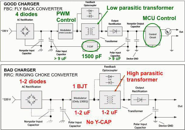 設(shè)計(jì)用于配合特定電話工作的OEM廠商的充電器具有較嚴(yán)格的噪聲規(guī)格,同時(shí),在充電電路中廣泛采用USB連接器為配件市場(chǎng)創(chuàng)造了巨大的機(jī)會(huì)。為了在其中進(jìn)行競(jìng)爭(zhēng),配件廠商充分地降低充電器成本。采用低成本電子器件的充電器給手機(jī)充電將注入很多噪聲到觸摸屏,而導(dǎo)致其很可能無(wú)法使用。