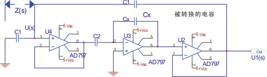 。如果 Rf 為常數,則f是Cx(x)函數,可根據測定f占空比,計算出Cx(x)的值。實際上,圖3電路僅可測量靜態電容,對于測量動態電容,必須對電路進行改進, 對Cx的電荷轉移過程進行保護。改進的方法是用電容性有源網絡在電路中來代替Cx,如圖4所示。U3是電荷轉移放大器,是網絡的中心;U2是跟隨器;U4是保持器,電路靜態諧振頻率以38KHz~40KHz為好。