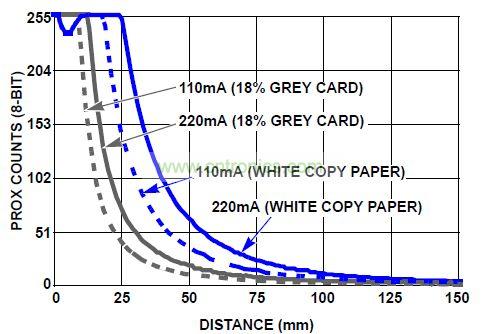 ISL29043是一款低功耗的環(huán)境光和接近檢測(cè)傳感器,典型的工作電流只有136μA(110μA用于傳感器和內(nèi)部電路,約28μA用于LED),這是在220毫安紅外LED電流,點(diǎn)亮脈沖電流持續(xù)時(shí)間為100μs,休眠時(shí)間為800mS的條件下測(cè)得的。