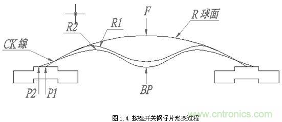 彈片自由狀態(tài)時,支撐點為P1,當(dāng)外力“F”開始向下施力時,彈片開始變形及位移,此時開始產(chǎn)生曲線。在以P1為支撐點時,外力“F”造成彈片變形,會產(chǎn)生最小的R1,此時的外力“F”即為彈片的OF值。過了彈片OF值位置時,支撐點P1會開始向P2位移,只要P1一位移,則R1又會變大,造成OF值變小,此時曲線即產(chǎn)生向下曲線(CK)。當(dāng)達(dá)到P2時,即為P2支撐之最大R2,此時即達(dá)到彈片的BP點(最小OD點)。若此時外力“F”繼續(xù)施力,則曲線又會向上產(chǎn)生曲線,上述過程如圖1.4所示。