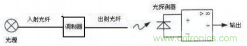 調制器是敏感元件,置于入射光纖和接收光纖之間,在被測對象的作用下,使敏感元件的光路遮斷或使敏感元件的光穿透率發生變化,這樣,光探測器所接收的光量便成為被測對象調制后的信號,經放大、解凋后,就可得到被測對象。