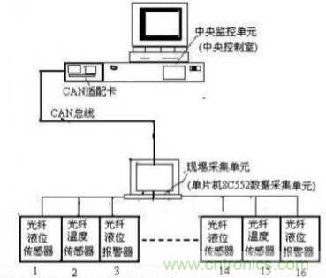 圖5所示可知,監測系統分別由中央控制式的中央監控單元和現埸采集單元(或數據采集單元)組成。現埸采集單元對油罐的液位、溫度信號進行數據的實時采集,同時完成數據統計、存貯;中央監控單元可以定期或不定期地從現埸采集單元獲取數據并完成圖像監測、數據統計、報表、打印及數據庫管理。而中央監控單元和現埸采集單元之間通過CAN總線連接在一起,在這個網絡中,中央監控單元處于主控位置,而現埸采集單元可以隨時響應中央監控單元的命令。其現埸采集單元由單片機8C552及采集、存儲、顯示、遙控和通信模塊組成,每個現埸采集單元可與光纖液位傳感器、光纖溫度傳感器及光纖液位報警器等16個設備相接。之所以應用CAN總線網絡結構是內由于CAN網絡具有的方便靈活、突出特性,抗干擾性、可靠性、實時性等特點。所有的光纖液位傳感器、光纖溫度傳感器及光纖液位報警器都可以通過一對雙絞線串接在一起,節省了空間、簡化了布線。