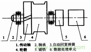 基于磁敏角度技術(shù)的拉線式位移傳感器的功能是將拉線的機械位移換成可以計量、記錄或傳送的電信號,主要由自動回復(fù)彈簧、輪轂、磁鐵以及數(shù)據(jù)處理單元等部分構(gòu)成,結(jié)構(gòu)如圖1所示。