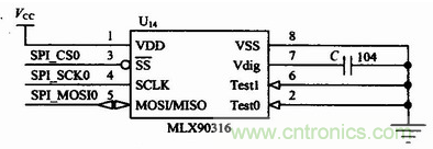 由于串行通信的輸出信號直接來自于MLX90316的內(nèi)部DSP輸出,SPI輸出模式更穩(wěn)定,誤差更小,并且具有更高的抗干擾能力。在本設(shè)計中,選用SPI接口,具體的硬件接口連接電路如圖3所示。在圖3中,MLX90316的SPI三根線與ARM LPC2136的SPl0口連接。SPI(SerialProtocol InterIace)總線接口是一種同步串行外設(shè)接口。這是一個4根信號線的串行接口協(xié)議,包括主、從兩種模式。這4根信號線分別是:時鐘線(SCK)、數(shù)據(jù)輸入線(MISO)、數(shù)據(jù)輸出線(MOSI)和從設(shè)備使能線(SS)。