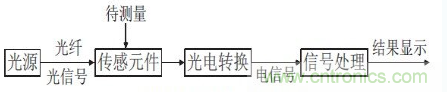 隨著工藝水平的提高,光纖技術目前相對成熟。光纖傳感器即為應用光纖傳輸的基本原理組合的一個廣電感應系統。通常的光纖傳感系統由光源、光導纖維、光傳感元件,光調制元件和信號處理部分組成。其工作原理如下圖所示:光源發出的光經過光導纖維進入光傳感元件,而在光傳感元件中受到周圍環境場的影響而發生變化的光再進入光調制機構,由其將傳感元件測量的參數調制成幅度、相位、偏振等信息,這一過程稱為光電轉換過程,最后利用微處理器進行信號分析。