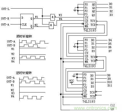 當(dāng)光電編碼器順時(shí)針旋轉(zhuǎn)時(shí),通道A輸出波形超前通道B輸出波形90°,D觸發(fā)器輸出Q(波形W1)為高電平,Q(波形W2)為低電平,上面與非門打開(kāi),計(jì)數(shù)脈沖通過(guò)(波形W3),送至雙向計(jì)數(shù)器74LS193的加脈沖輸入端CU,進(jìn)行加法計(jì)數(shù);此時(shí),下面與非門關(guān)閉,其輸出為高電平(波形W4)。當(dāng)光電編碼器逆時(shí)針旋轉(zhuǎn)時(shí),通道A輸出波形比通道B輸出波形延遲90°,D觸發(fā)器輸出Q(波形W1)為低電平,Q(波形W2)為高電平,上面與非門關(guān)閉,其輸出為高電平(波形W3);此時(shí),下面與非門打開(kāi),計(jì)數(shù)脈沖通過(guò)(波形W4),送至雙向計(jì)數(shù)器74LS193的減脈沖輸入端CD,進(jìn)行減法計(jì)數(shù)。