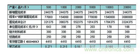 4”圓晶片生產(chǎn)線生產(chǎn)MEMS壓力傳感器Die成本估計如表所示,新增固定成本是指為該項目投入的人員成本和新設(shè)備的折舊(人員:專家1名+MEMS設(shè)計師2名+工程師4名+工藝師5名+技工12名,年成本147萬元,新增設(shè)備投入650萬元,按90%四年折舊計算);現(xiàn)有4”線成本是指在5次光刻條件下使用4”線的成本(包括人工、化劑、水電、備件等的均攤成本);硅片材料成本是指雙拋4寸硅片的價格。