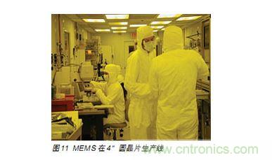 與傳統(tǒng)IC行業(yè)注重二維靜止的電路設(shè)計不同,MEMS以理論力學為基礎(chǔ),結(jié)合電路知識設(shè)計三維動態(tài)產(chǎn)品。對于在微米尺度進行機械設(shè)計會更多地依靠經(jīng)驗,設(shè)計開發(fā)工具(Ansys)也與傳統(tǒng)IC(如EDA)不同。MEMS加工除了使用大量傳統(tǒng)的IC工藝,還需要一些特殊工藝,如雙面刻蝕,雙面光刻等。MEMS比較傳統(tǒng)IC,工藝簡單,光刻步驟少,MEMS生產(chǎn)的一些非標準的特殊工藝,工藝參數(shù)需要按照產(chǎn)品的要求來進行調(diào)整。由于需要產(chǎn)品設(shè)計、工藝設(shè)計和生產(chǎn)三方面的密切配合,IDM的模式要優(yōu)于Fabless+Foundry的模式。MEMS對封裝技術(shù)的要求很高。傳統(tǒng)半導(dǎo)體廠商的4〃生產(chǎn)線正面臨淘汰,即使用來生產(chǎn)LDO,其利潤也非常低,但是,如果生產(chǎn)MEMS,則可獲得較高的利潤。4〃線上的每一個圓晶片可生產(chǎn)合格的MEMS壓力傳感器Die5-6K個,每個出售后,可獲成本7-10倍的毛利(如圖10)。轉(zhuǎn)產(chǎn)MEMS對廠家的工藝要求改動不大,新增輔助設(shè)備有限,投資少、效益高。MEMS芯片與IC芯片整合封裝是集成電路技術(shù)發(fā)展的新趨勢,也是傳統(tǒng)IC廠商的新機遇。圖11是MEMS在4〃圓晶片生產(chǎn)線上。