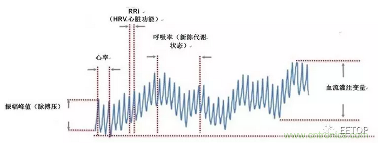 光學(xué)心率傳感器可生成測(cè)量心率的PPG波形并將該心率數(shù)據(jù)作為基礎(chǔ)生物計(jì)量值,但是利用PPG波形可以測(cè)量的對(duì)象遠(yuǎn)不止于此。盡管很難取得和維護(hù)精確的PPG測(cè)量結(jié)果(我們將在下一篇詳細(xì)論述它),但是如果您能夠成功獲得精確的PPG測(cè)量結(jié)果,它將發(fā)揮強(qiáng)大的作用。高品質(zhì)PPG信號(hào)是當(dāng)今市場(chǎng)需求的大量生物計(jì)量的基礎(chǔ)。圖2是經(jīng)過(guò)簡(jiǎn)化的PPG信號(hào),該信號(hào)代表了多個(gè)生物計(jì)量的測(cè)量結(jié)果。