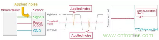 以上這樣,One chip傳感器的信號線或電源線施加噪聲時(shí),會(huì)發(fā)生通信停止或輸出值紊亂的誤操作。