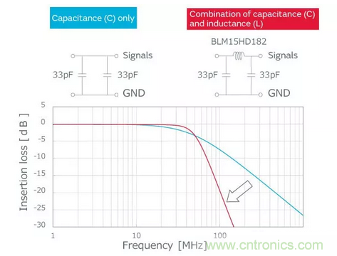 噪聲級別小或信號和噪聲的頻率相差大的情況下,可以只用電容器進(jìn)行降噪,但如果信號頻率和噪聲頻率相近時(shí),需要電感器和電容器組合來構(gòu)成插入損耗陡峭的濾波器。
