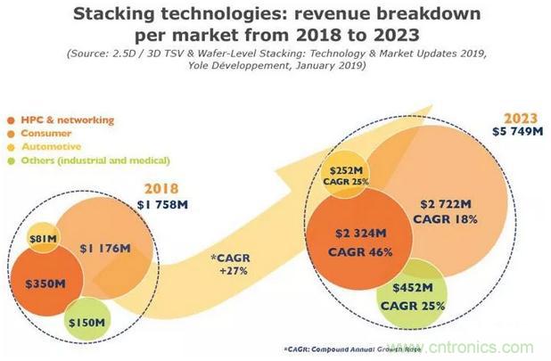 消費(fèi)類市場(主要是CIS應(yīng)用),是2018年堆疊封裝營收的最大貢獻(xiàn)者,占據(jù)了65%以上的市場份額。盡管如此,高性能計(jì)算(HPC)是推動(dòng)3D封裝技術(shù)創(chuàng)新的主要應(yīng)用,到2023年期間,該應(yīng)用增長速度最快,市場份額預(yù)計(jì)將從2018年的20%增長到2023年的40%。